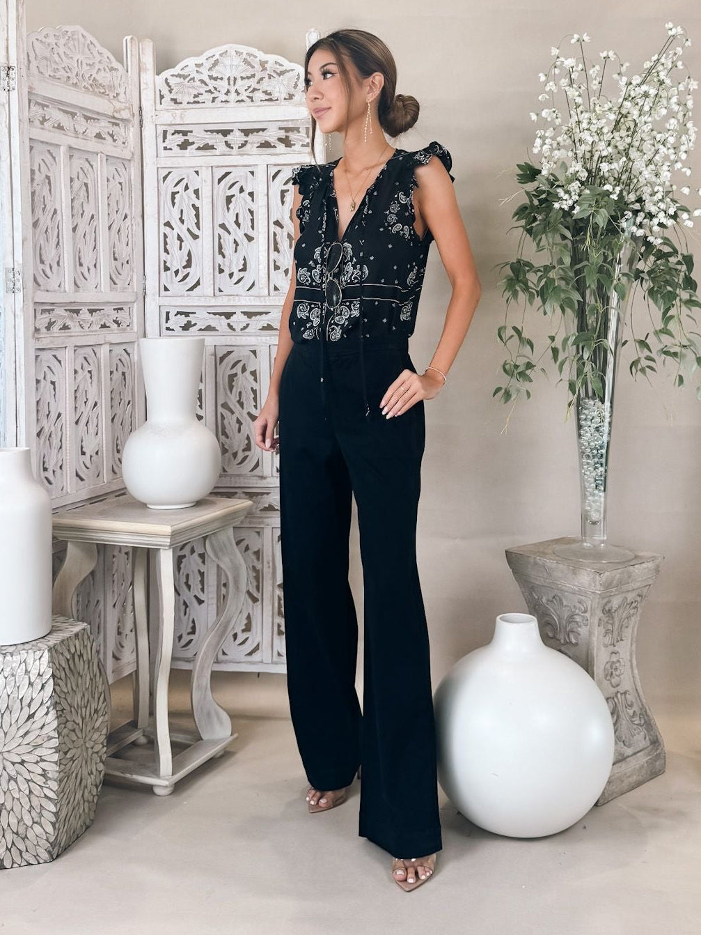 Airy and detailed, the Ruffle Sleeve Tie Neck Top is an elevated style designed for late summer into early fall. Sleeveless design with ruffled armholes – adds soft volume and a feminine edge. Adjustable tie neckline – wear it open for a relaxed look or tied for a polished finish. Loose, draped fit – falls effortlessly off the body for breathable comfort.