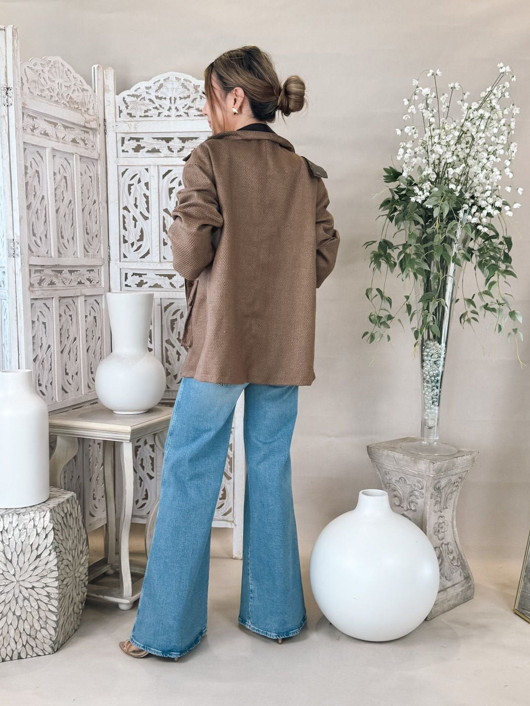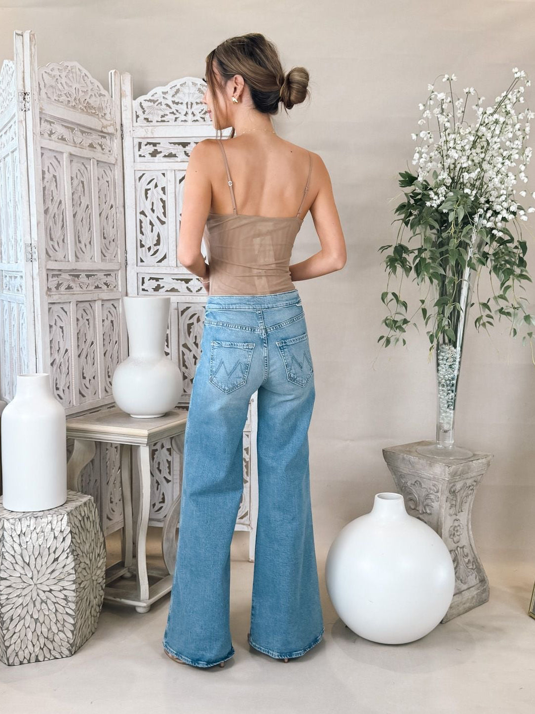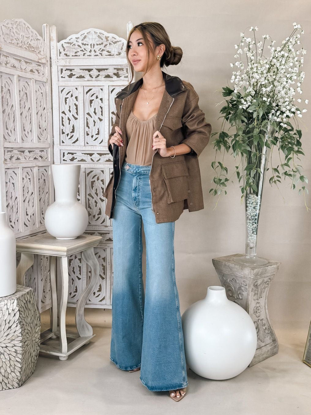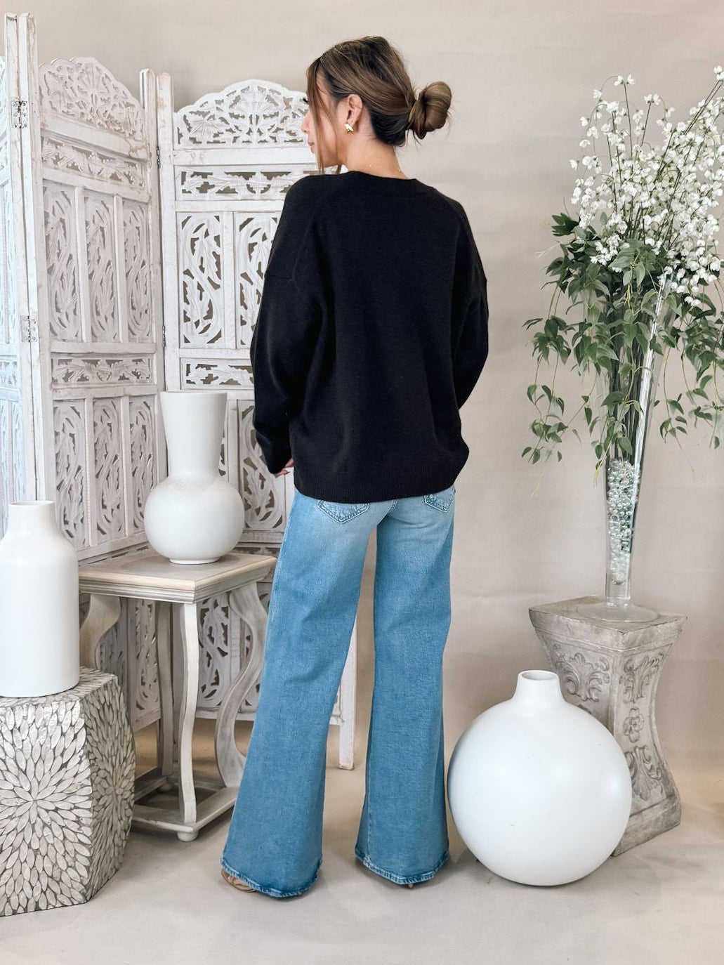 A floor-grazing length adds to the dramatic, vintage-inspired look of loose-fitting jeans made from soft, stretchy denim.