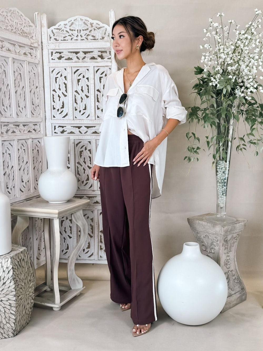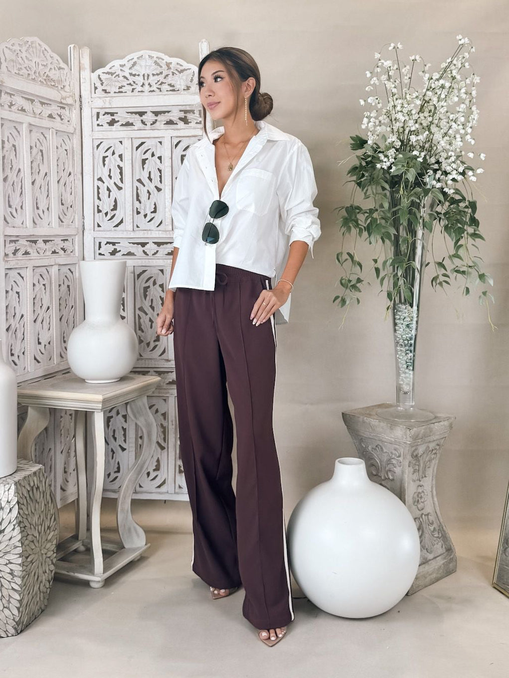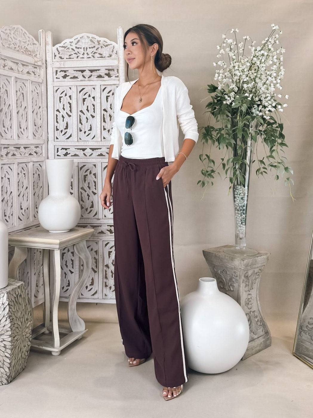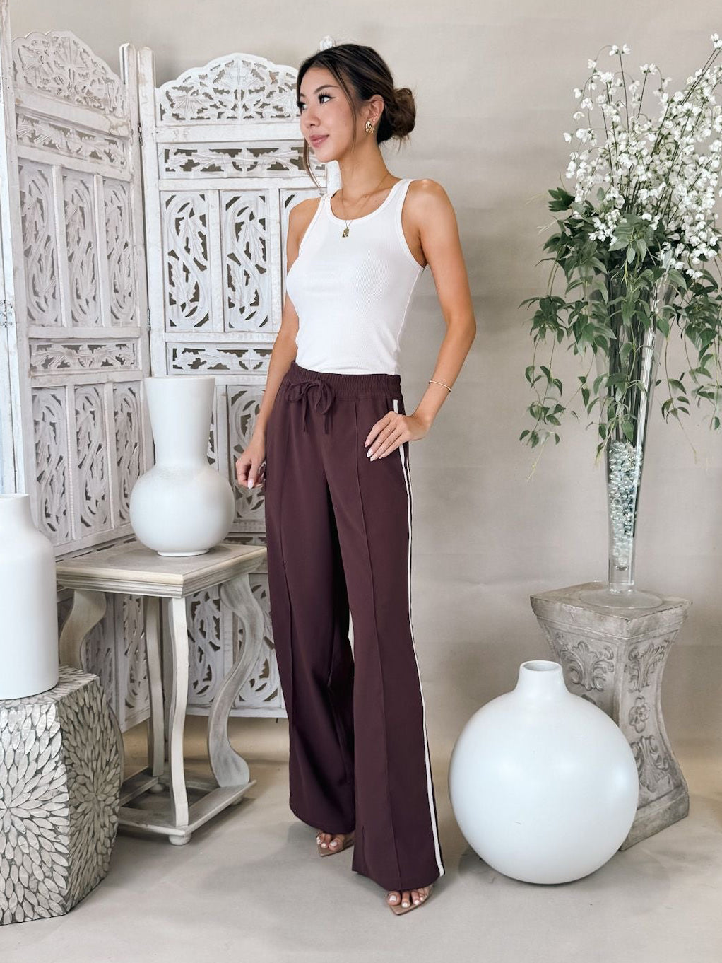 Light, flowy, and endlessly wearable, this full-length pant is cut from a breathable crinkle woven fabric with contrast stripe detail at the seams. The high rise and elastic waistband make it your new favorite for everyday looks.