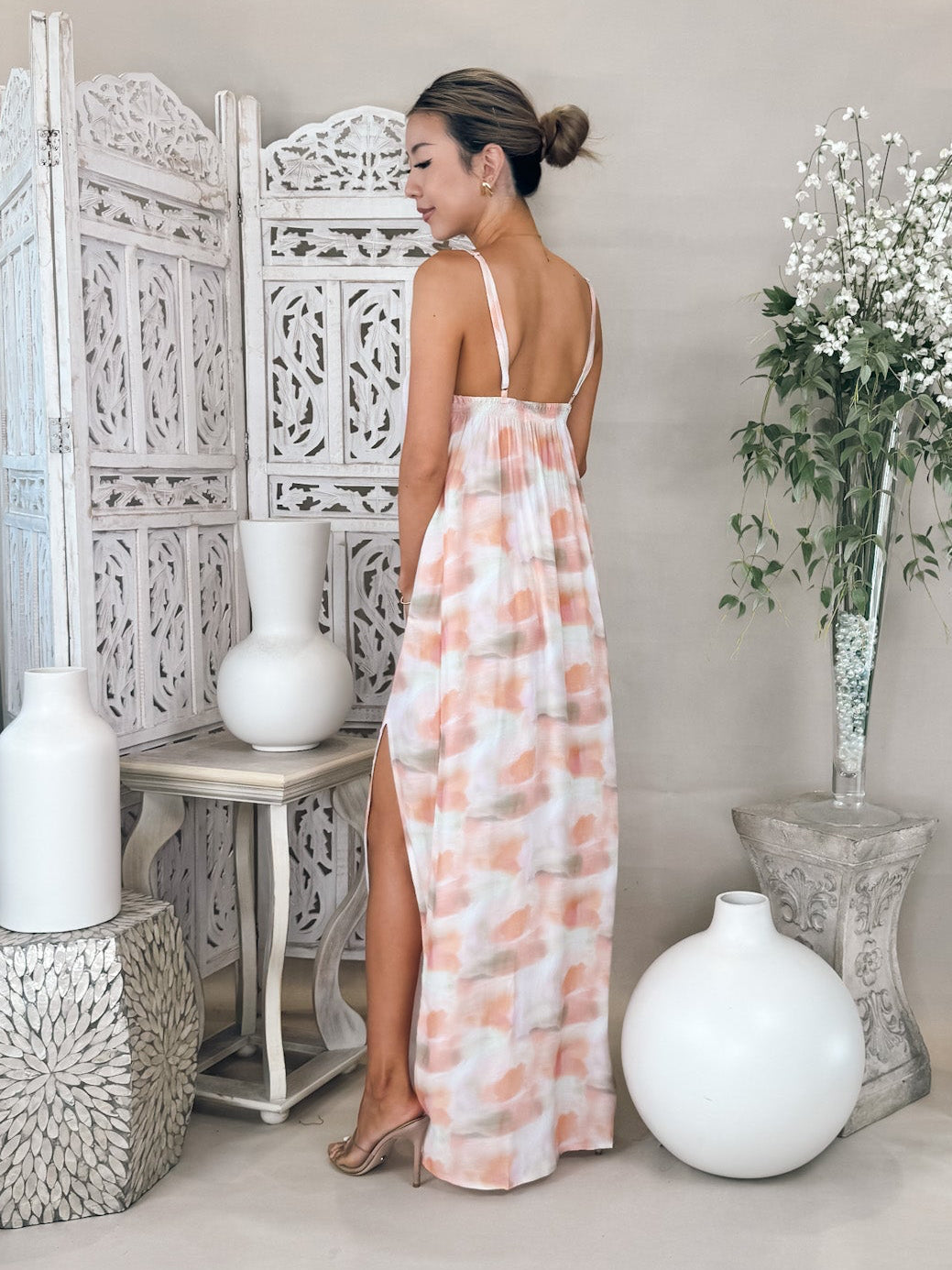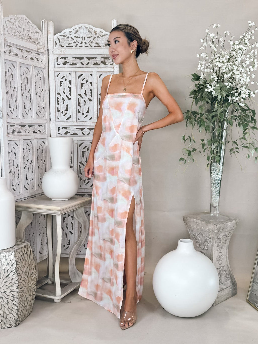 Long column dress with front panel detail. Featuring adjustable criss cross back straps and high thigh side slit. Fully lined.