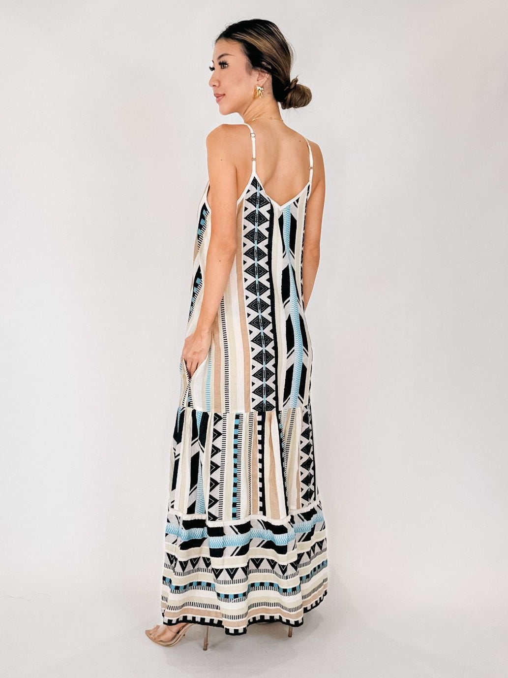 This breezy dress, made from 100% cotton, showcases spaghetti straps and a tiered design for a flowy and fun silhouette. The vibrant multicolor tribal pattern adds a boho charm perfect for summer. 75% Cotton 25% Polyester