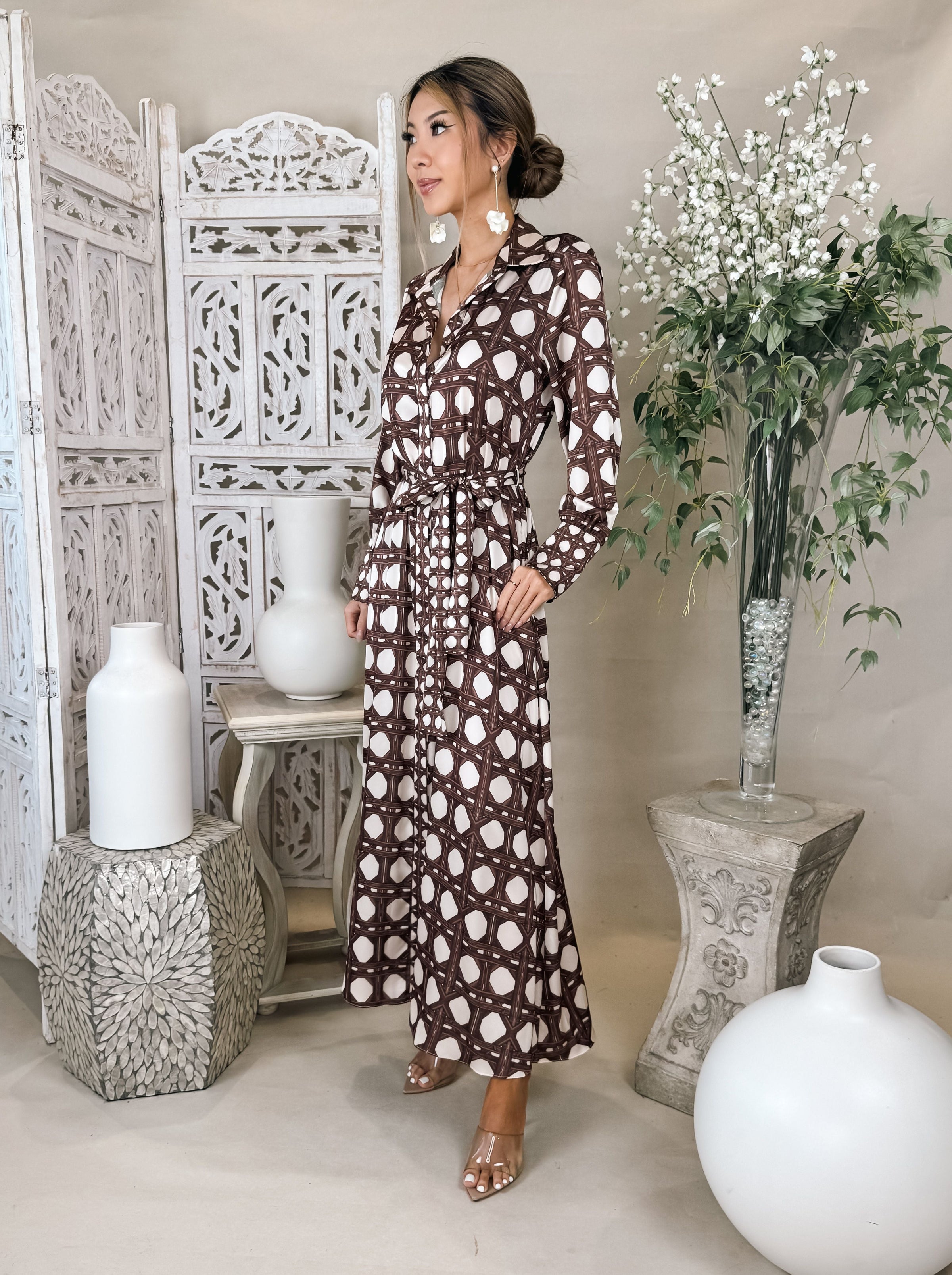 Chocolate Rattan printed satin. This ankle-grazing silhouette features a covered button placket with a contrast scale rattan print that extends to the hem. It has a fold collar, long sleeves with wide button cuffs in the same contrast scale print, and slit pockets. An optional self-tie belt offers styling flexibility.