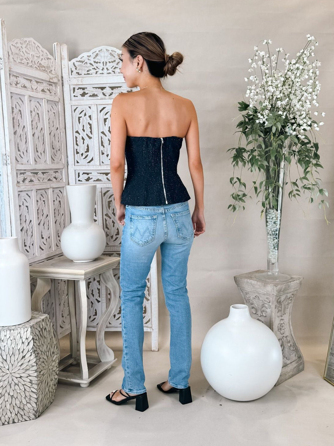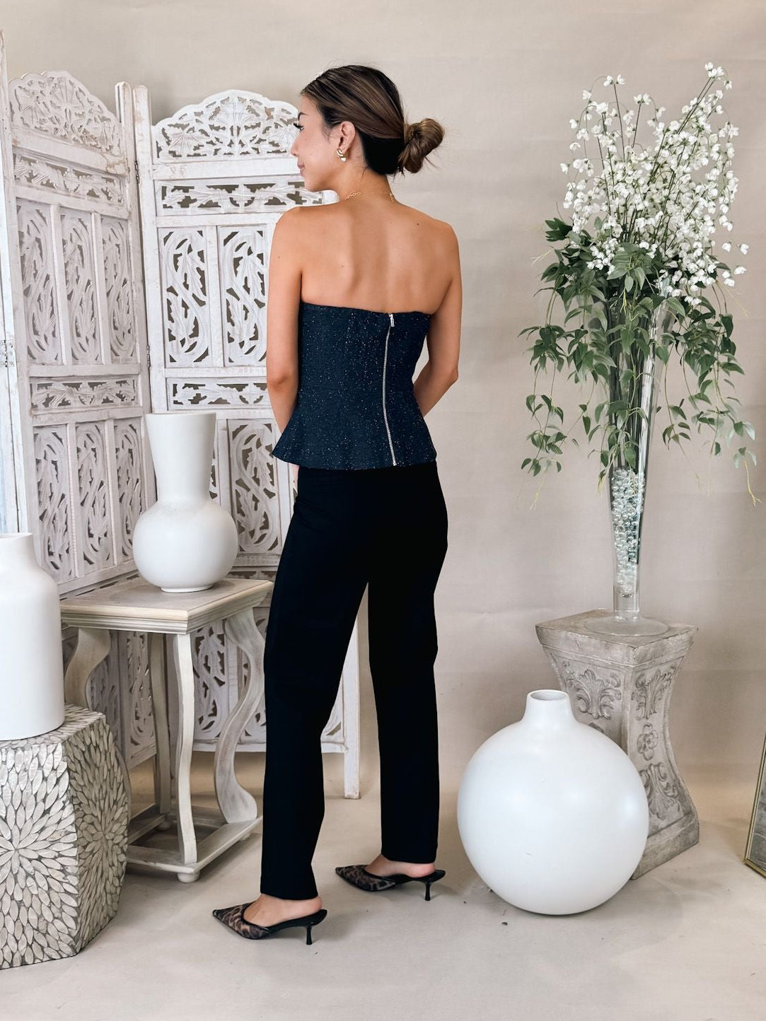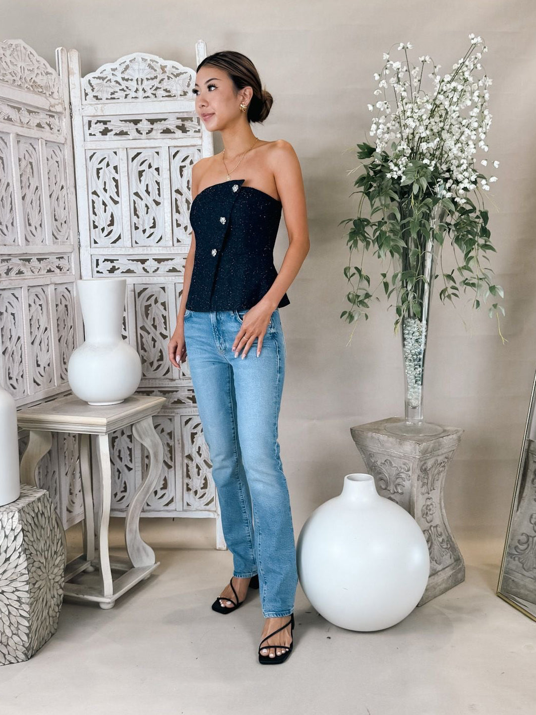 • Asymmetrical strapless tweed top