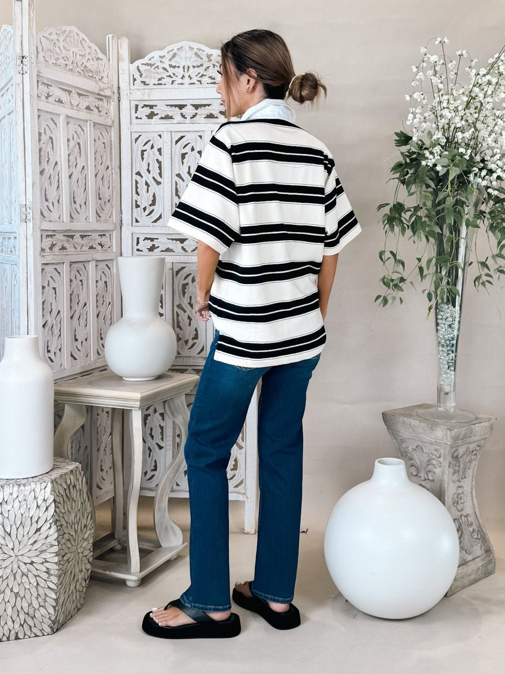 This relaxed jersey tee in a timeless stripe, featuring a contrast twill collar, is perfect for effortless everyday styling.