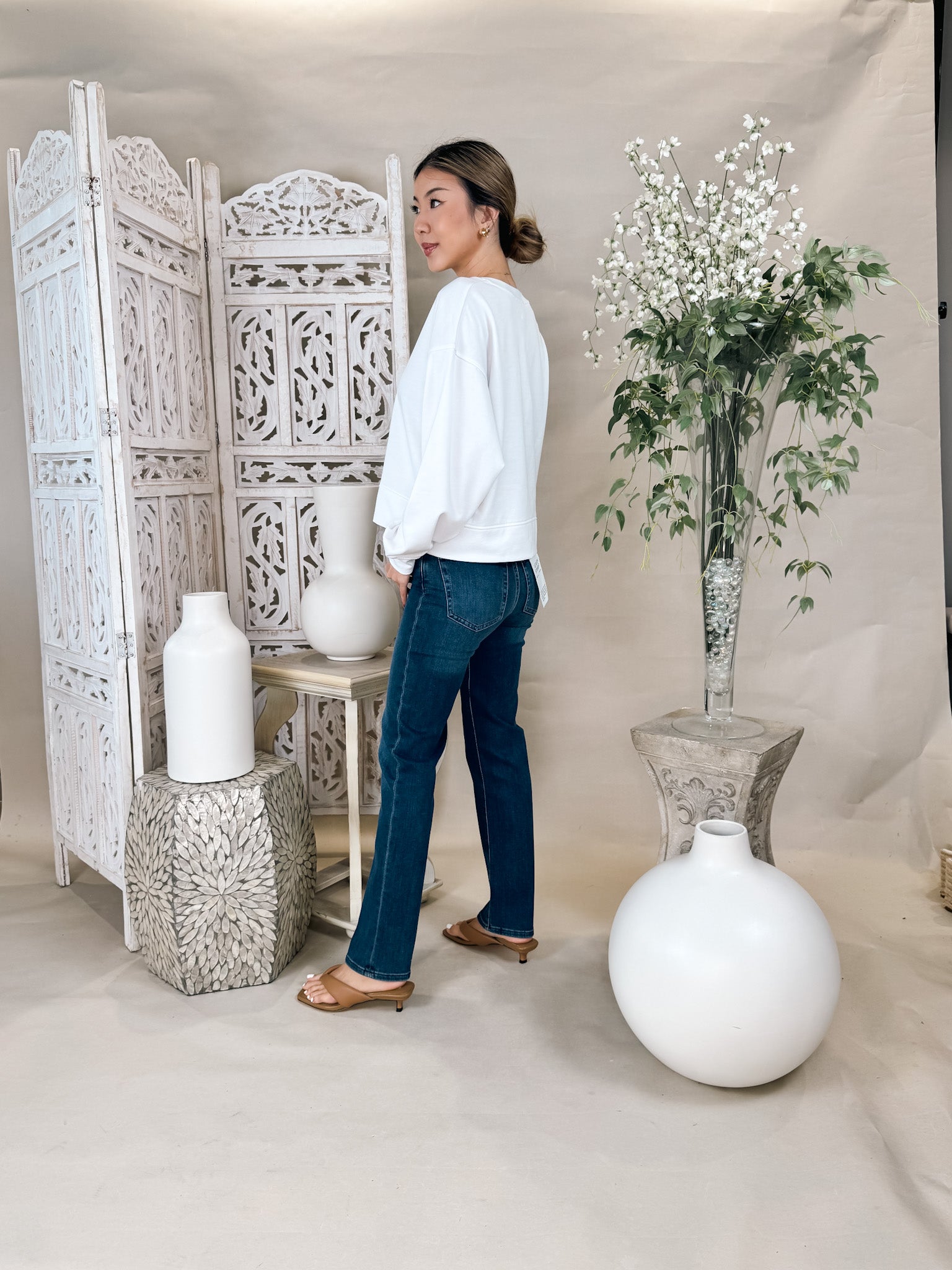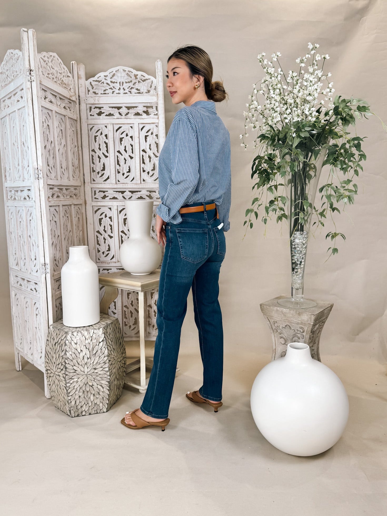 • Features a high rise and relaxed straight leg that hits at the ankle