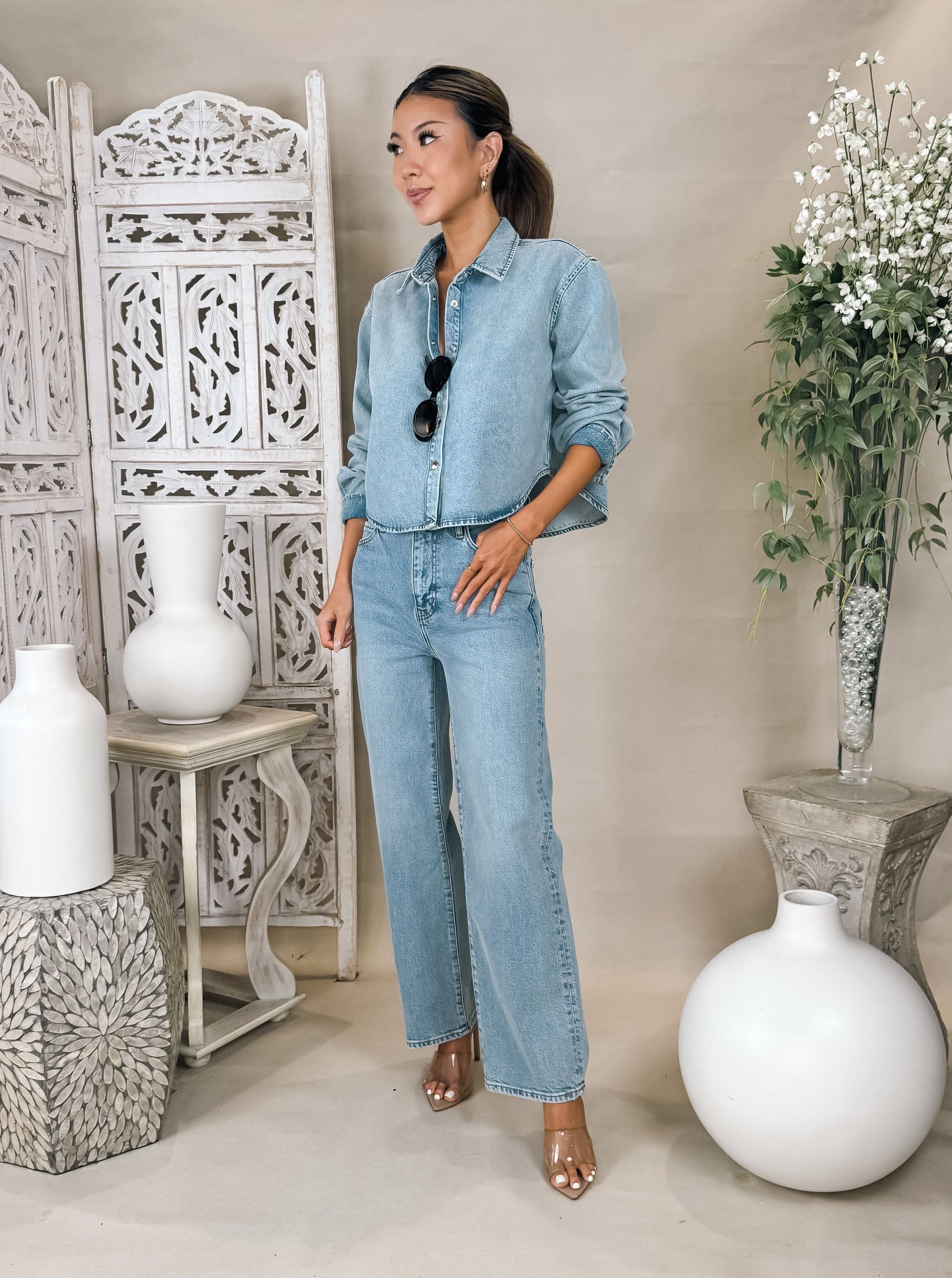 Bring a little honky-tonk into your everyday with this subtly cropped denim shirt designed with gleaming snaps and a box pleat in back that brings a swinginess to the boxy cut.