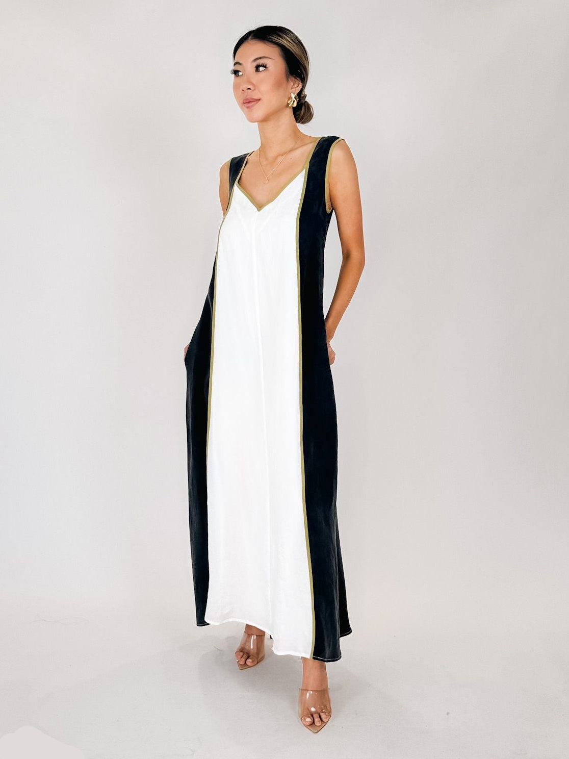 Cut in a loose silhouette of airy natural fabrications. From contrast color blocking to a vibrant binding, this dress makes a stunning statement.