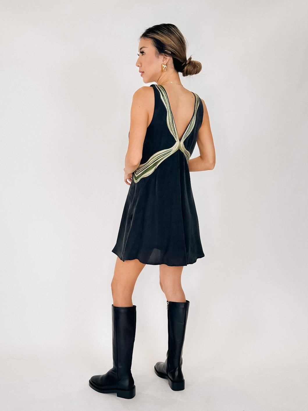 he Capri Dress is a perfectly flattering mini shape, with an elegant v-neckline and full hem. Complementing its silhouette is a gorgeous botanical inspired embroidery designed in-house.