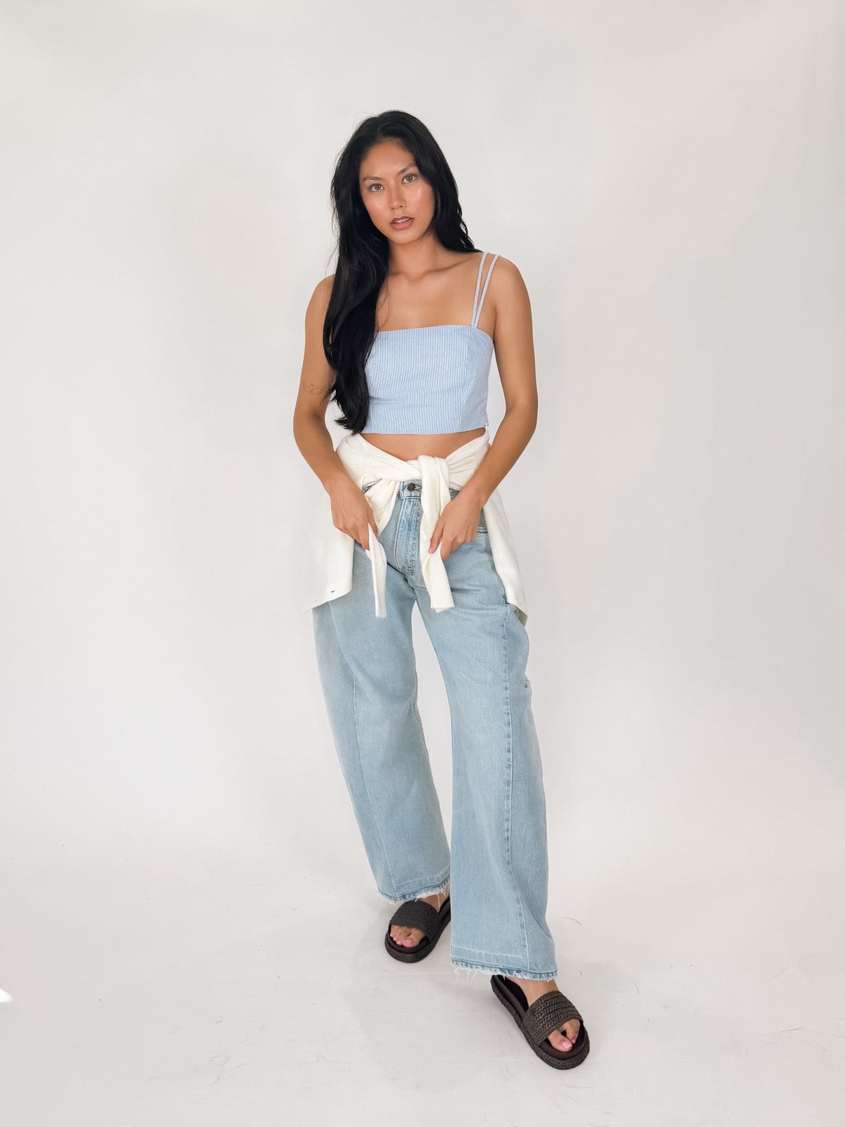 - Striped woven crop top with straight neckline, double straps