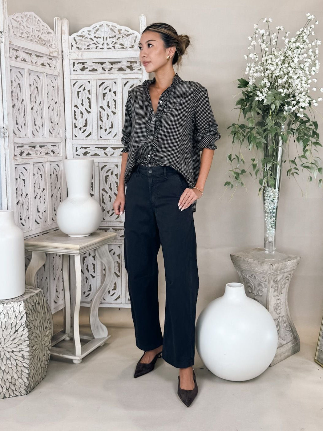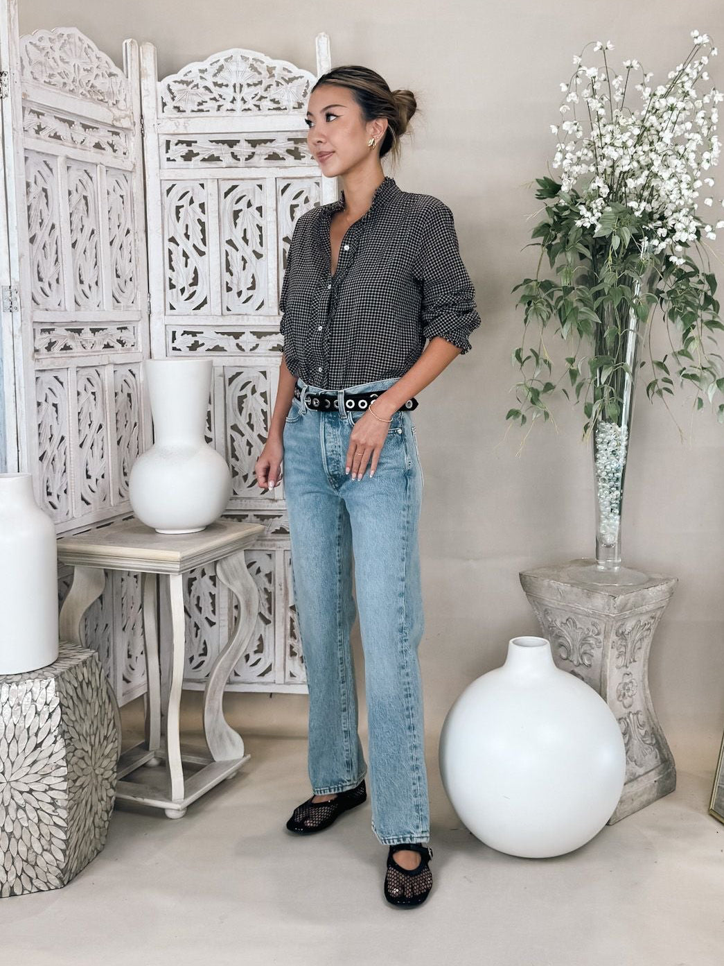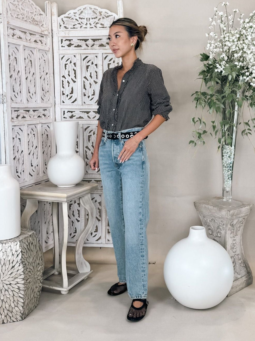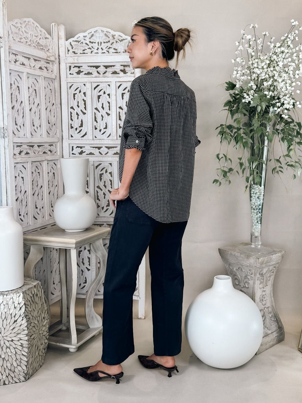 Amelie is new this season in our cotton gingham check with added stretch for ease of comfort. This button-front shirt features raw edge ruffle details throughout the neck, front placket, and cuffs.