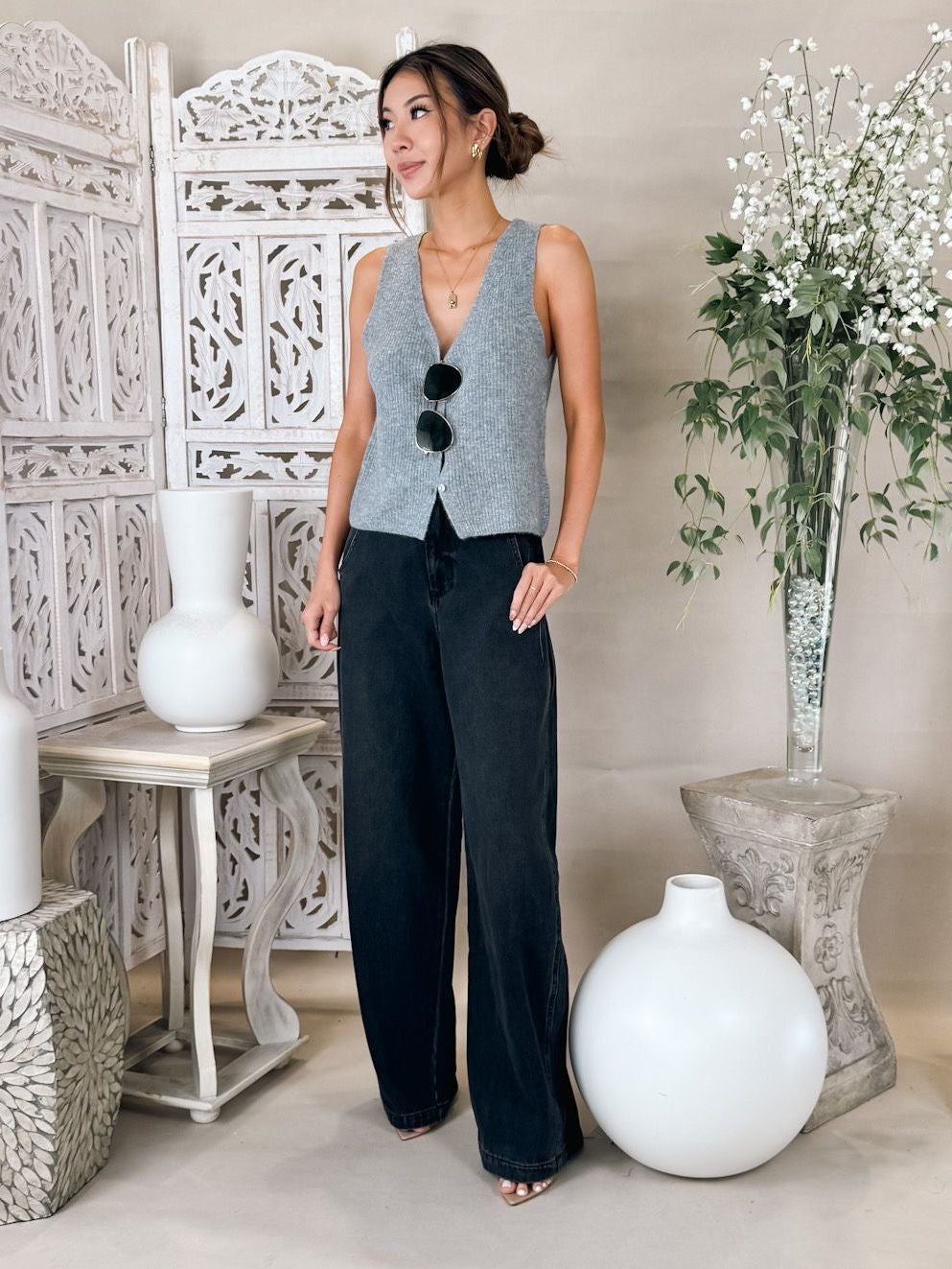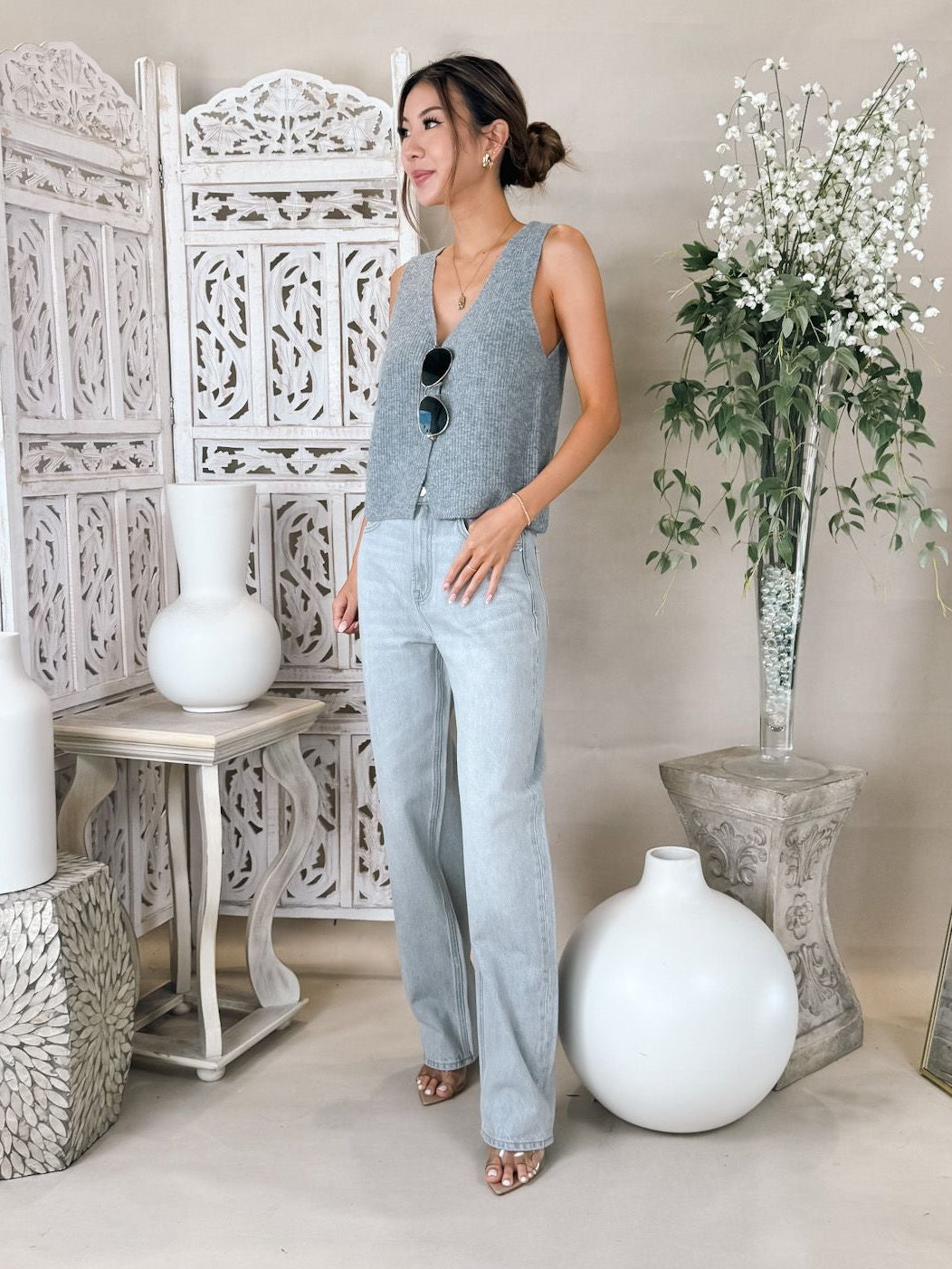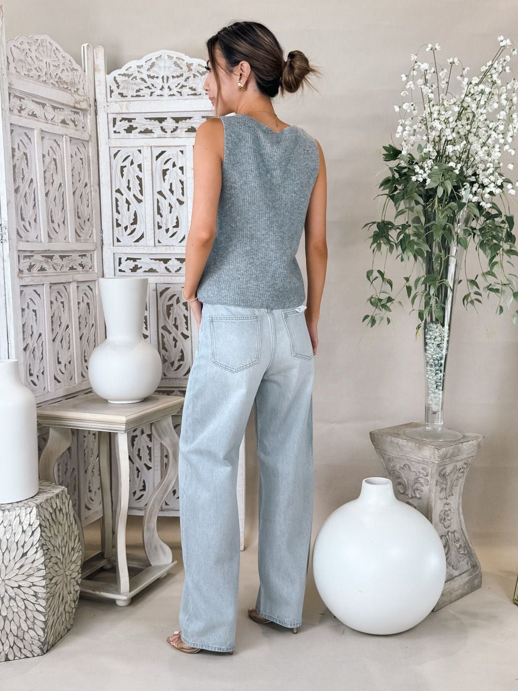 Designed in our soft Cozy Summer yarns, this sleeveless v-neck brings an airy weight and textured rib detailing. A standout piece that works solo in warm weather or layered as temps cool.