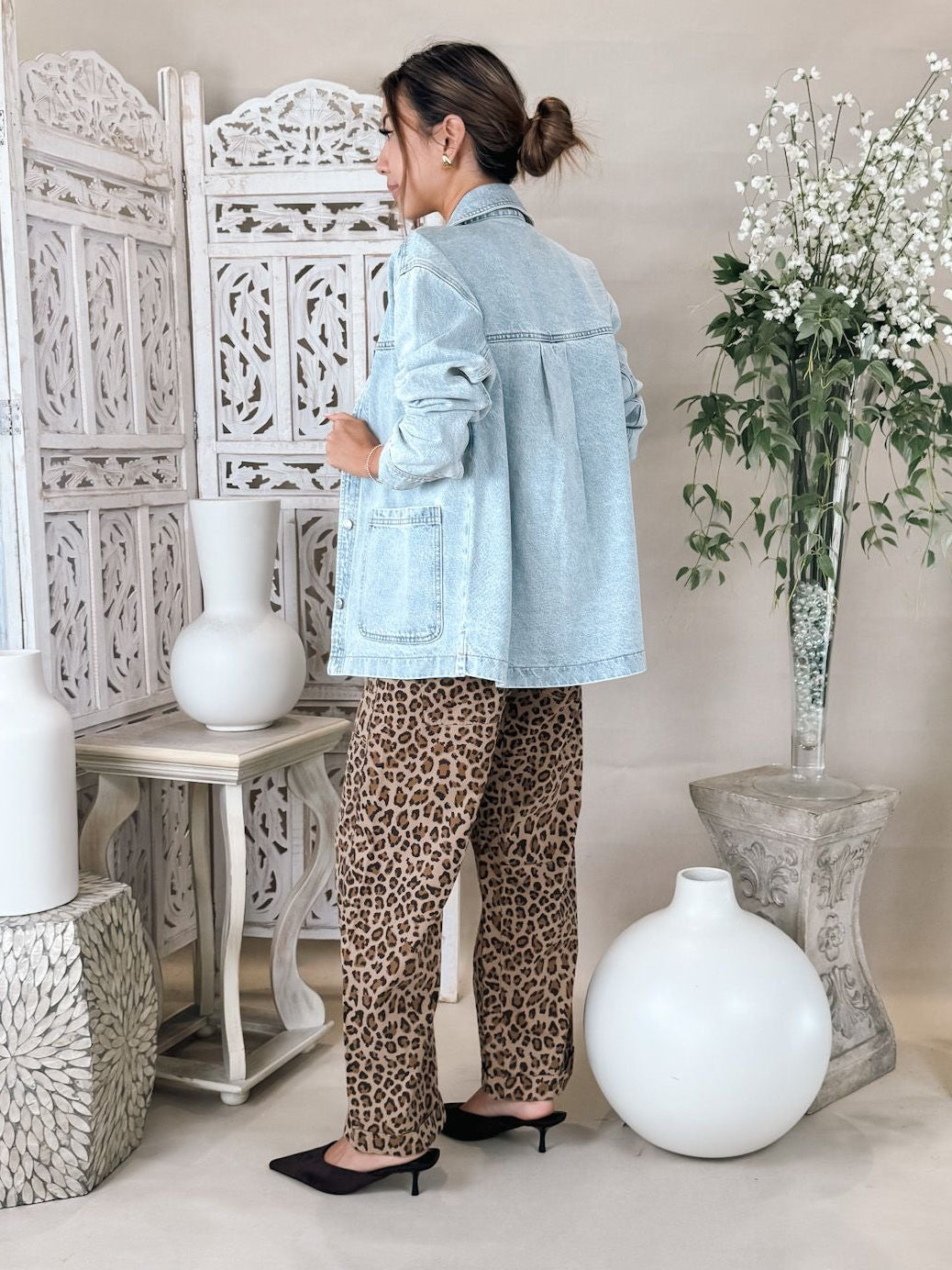 Made from 100% cotton denim with a mineral wash finish, this collared jacket has patch pockets and a button front closure. The easy oversized fit and midweight feel make it a must-have for layered looks.
